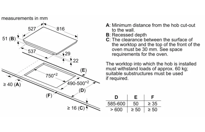| Kích thước mặt bếp (R x S) | 816mm - 527mm |